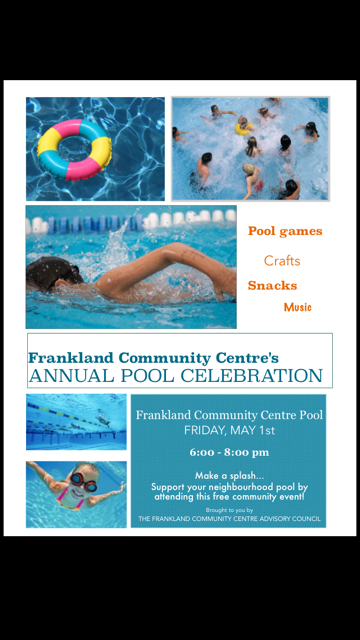 The Frankland Community Centre is having a pool party this Friday, May 1st from 6–8pm.